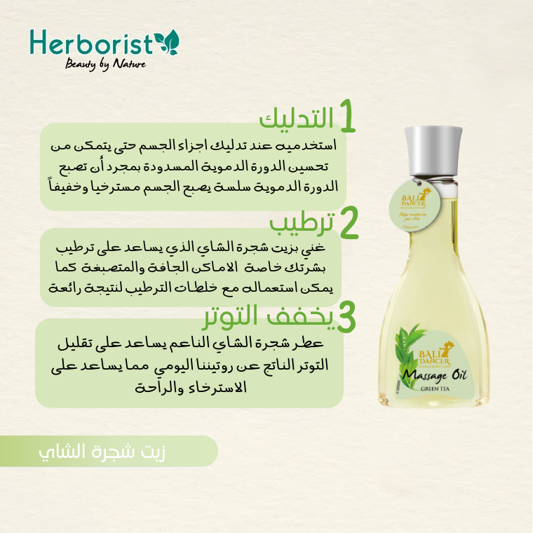 اختبري راحة الأعشاب النقية مع زيت مساج للجسمبالشاي الأخضر – لمسة استرخاء ناعمة، وترطيب يدوم! اطلبيه الآن وتمتعي بجلسة تدليك طبيعية تنعش الجسم والروح!